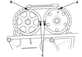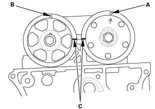 1. Set the No. 1 piston at top dead center (TDC). The punch mark (A) on the VTC actuator and the punch mark (B) on the exhaust camshaft sprocket should be at the top. Align the TDC marks (C) on the VTC actuator and the exhaust camshaft sprocket.