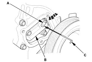 1. Rotate the crankshaft counterclockwise to align the holes on the lock (A) and the auto-tensioner (B), then insert a 1.2 mm (3/64 in) diameter pin (C) into the holes. Turn the crankshaft clockwise to secure the pin.