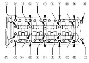 2. Remove the camshaft holder bolts. To prevent damaging the camshafts, loosen the bolts, in sequence, two turns at a time.