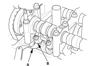 1. Set the camshaft holders (A) and cam chain guide B in place.
