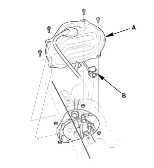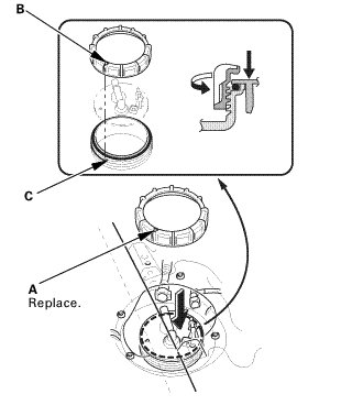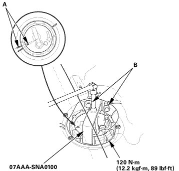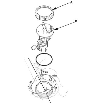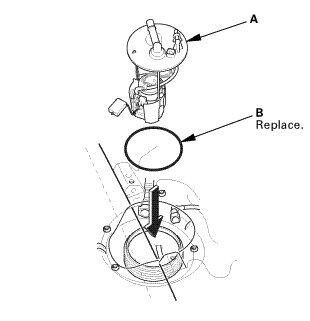 1. Insert the fuel tank unit (A) into the fuel tank with a new O-ring (B).