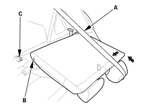 1. Extend the center seat belt (A), then install the pivot shaft (B) to the center pivot bracket (C).