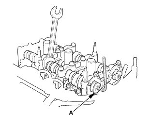 1. Hold the camshaft with an open-end wrench, then loosen the bolt (A).