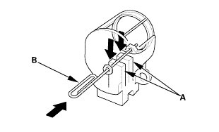 1. Push the brushes (A) in, then insert a pin or drill bit (B) (about 1.6 mm (1/16 in) diameter) to hold them in place.