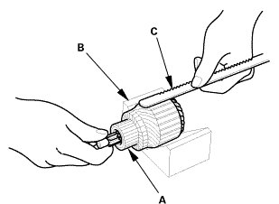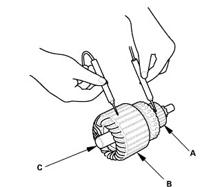 8. Use an ohmmeter to check for continuity between the commutator (A) and the armature coil core (B), and between the commutator and the armature shaft (C). If there is continuity, replace the armature.