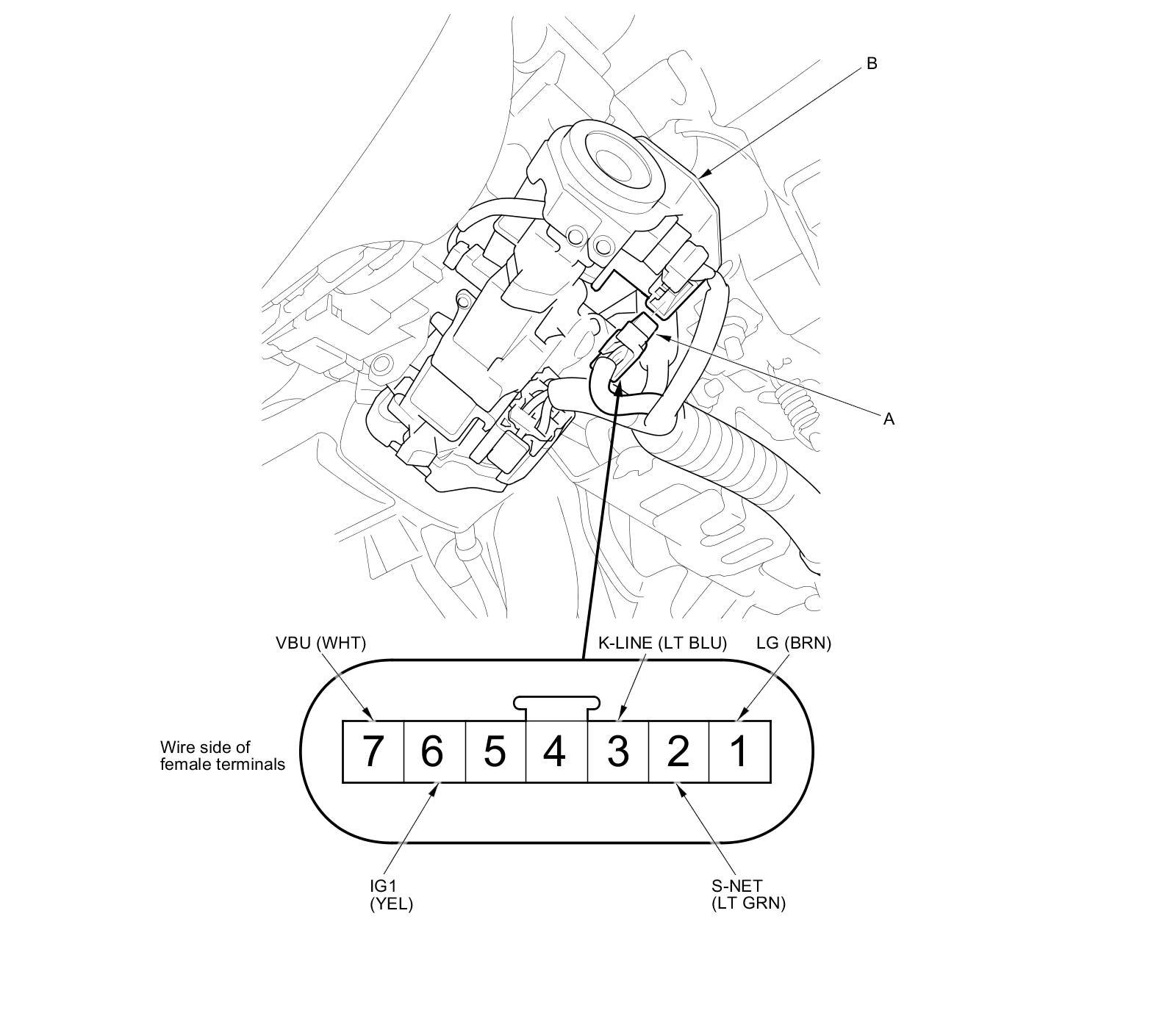 2. Disconnect the 7P connector (A) from the immobilizer-keyless control unit (B).
