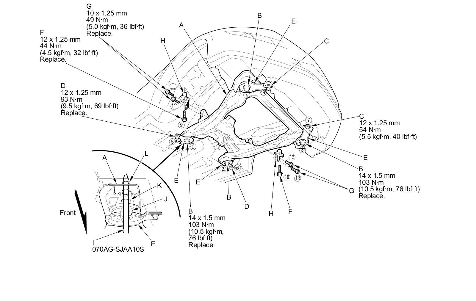 After removing the subframe mounting bolts, the front subframe middle rubber mount mounting bolts, the front subframe front stiffener mounting bolts, the front subframe rear stiffener mounting bolts, the rear engine mounting base bracket mounting bolts, and the rear engine mounting upper base bracket mounting bolts, be sure to replace them with new ones.