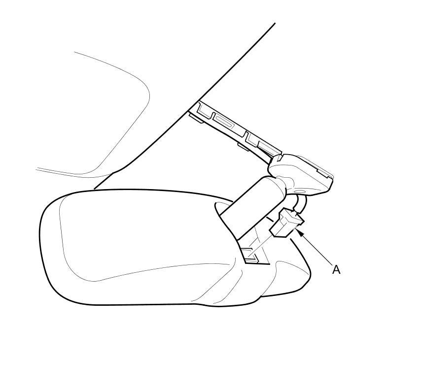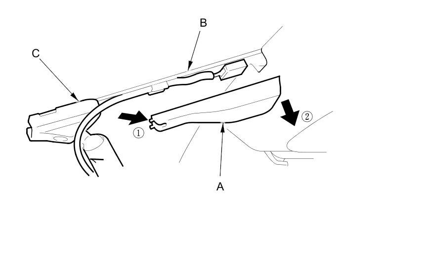 1. Slide the rearview mirror harness cover (A) backward, then remove the mirror harness cover from the mirror harness cover base (B) and the base (C).