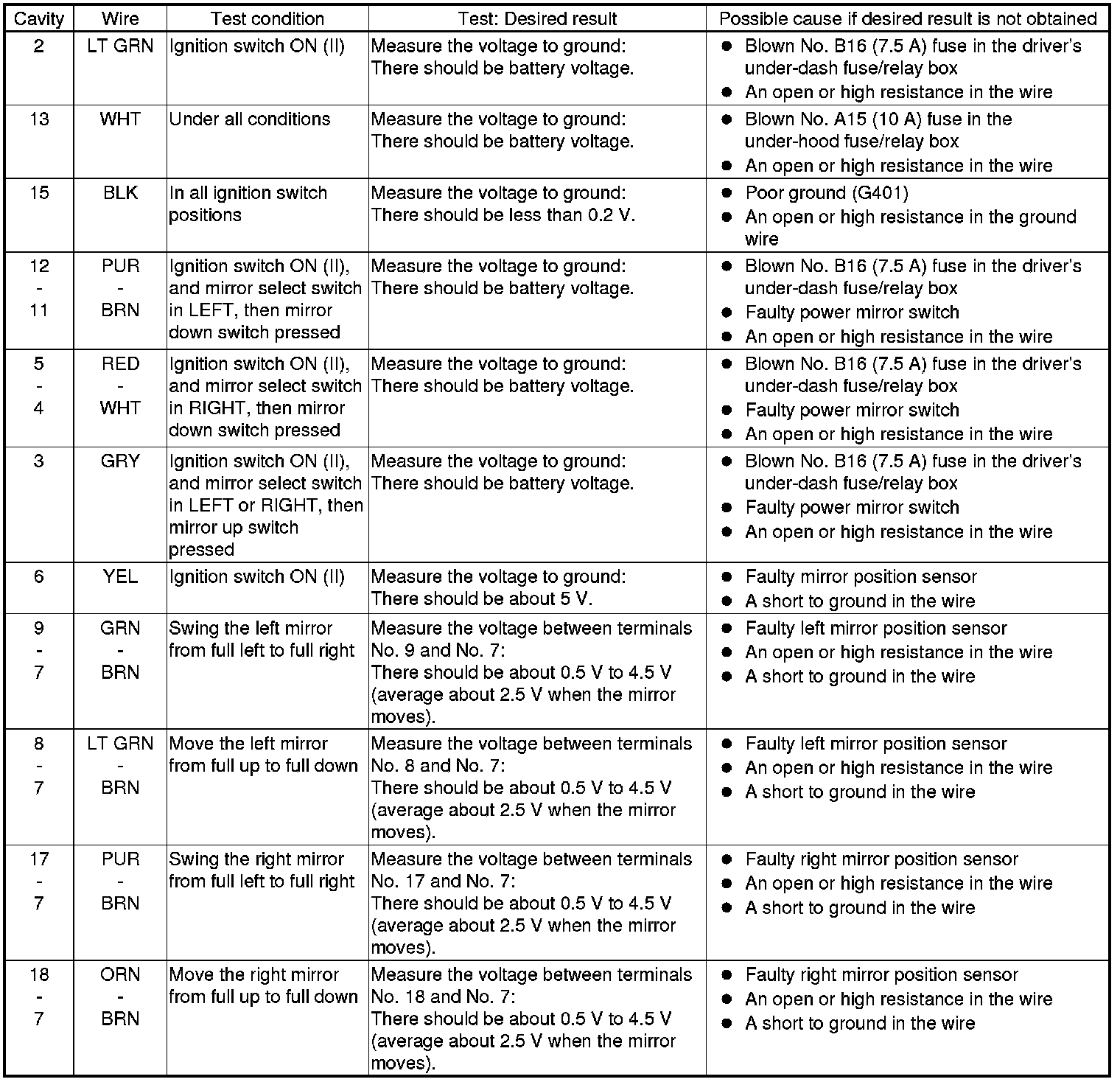 5. Reconnect the connector to the power mirror control unit, and do the following input tests: