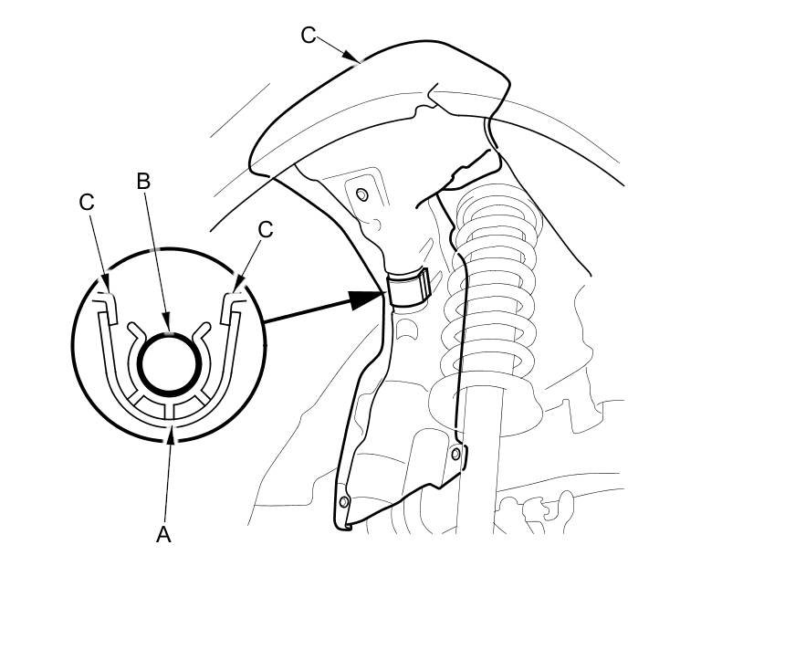 - Make sure the fuel pipe protector (C) is inserted securely into the fuel pipe protector clip.