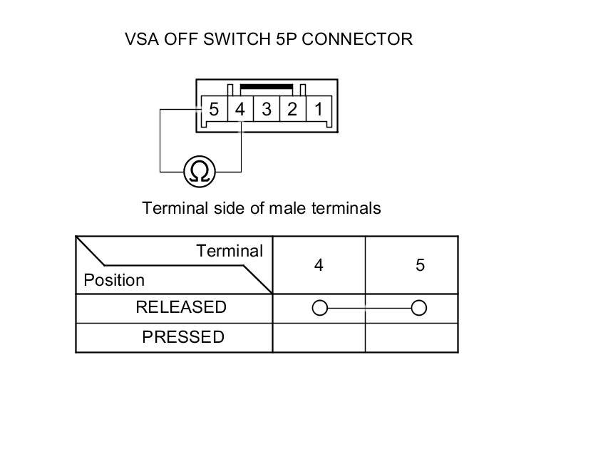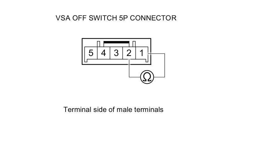 5. On the switch side, check for continuity between VSA OFF switch 5P connector terminals No. 1 and No. 2. There should be continuity at all times.