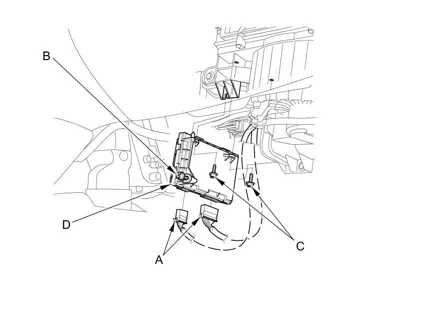 2. Disconnect the connectors (A). Loosen the bolt (B) and remove the bolts (C) from the climate control unit (D).