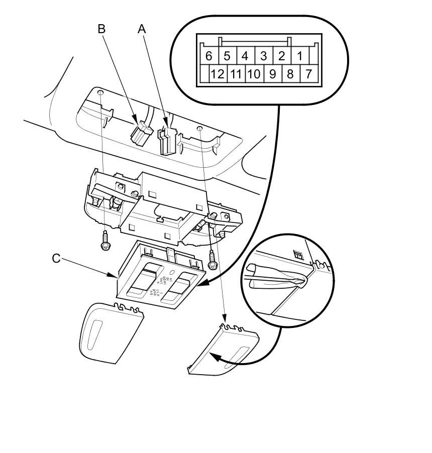2. Disconnect the moonroof switch 12P connector (A) and the map light 3P connector (B).