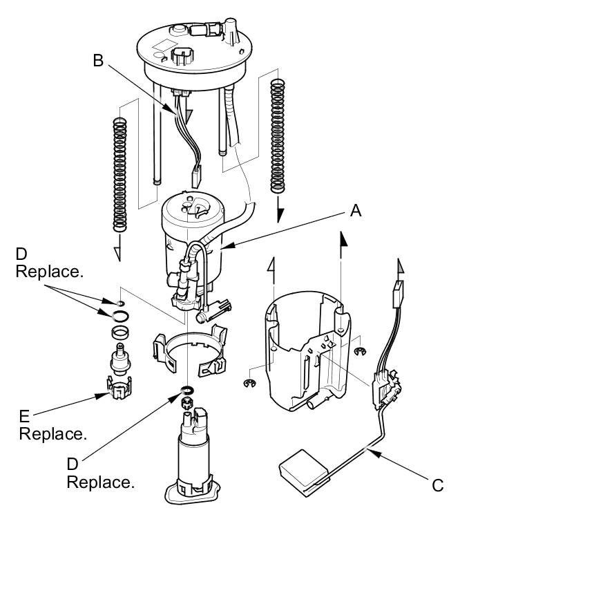 4. Install the parts in the reverse order of removal with new O-rings (D) and a new bracket (E). When installing the fuel tank unit, align the marks on the unit and the fuel tank.