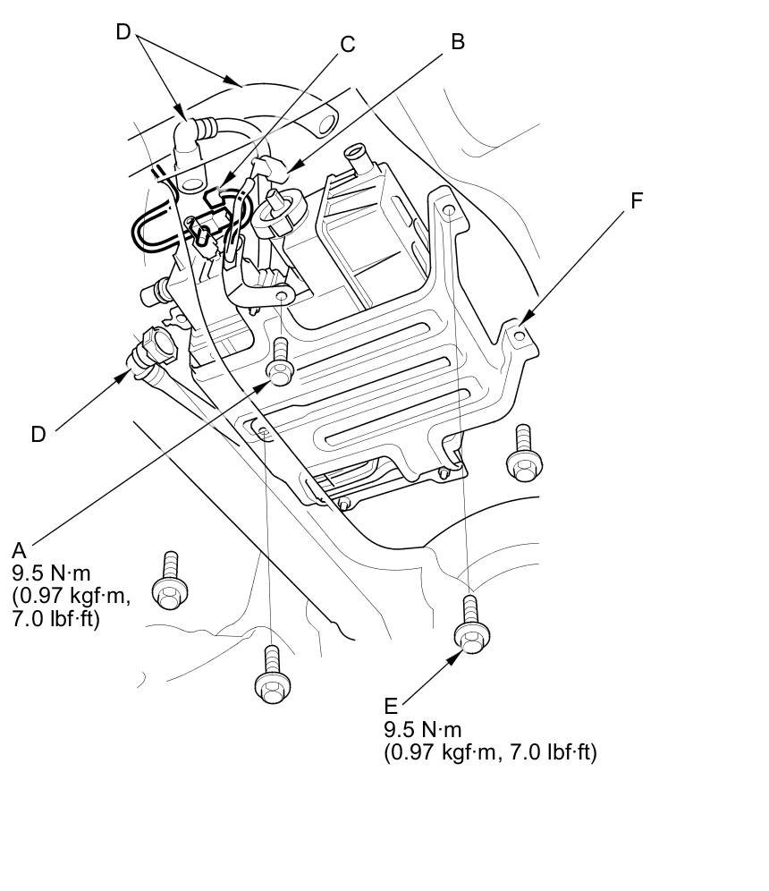 2. Remove the bolts (E), and move the EVAP canister assembly (F) to the rear.