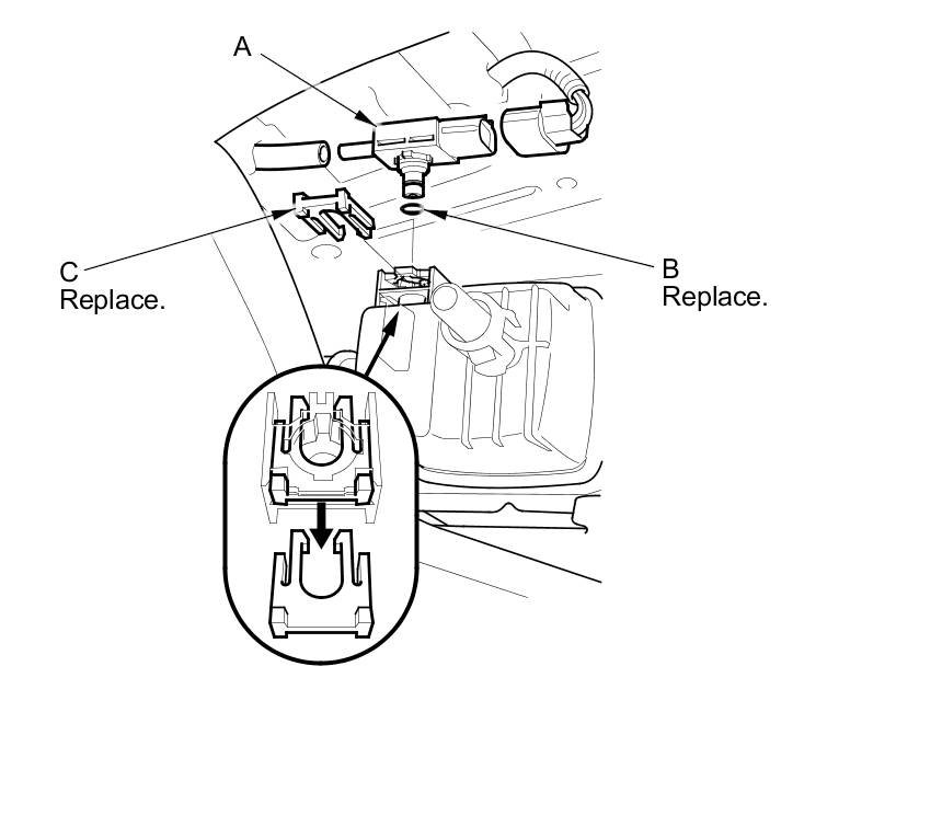 4. Install the parts in the reverse order of removal with a new O-ring (B) and a new retainer (C).