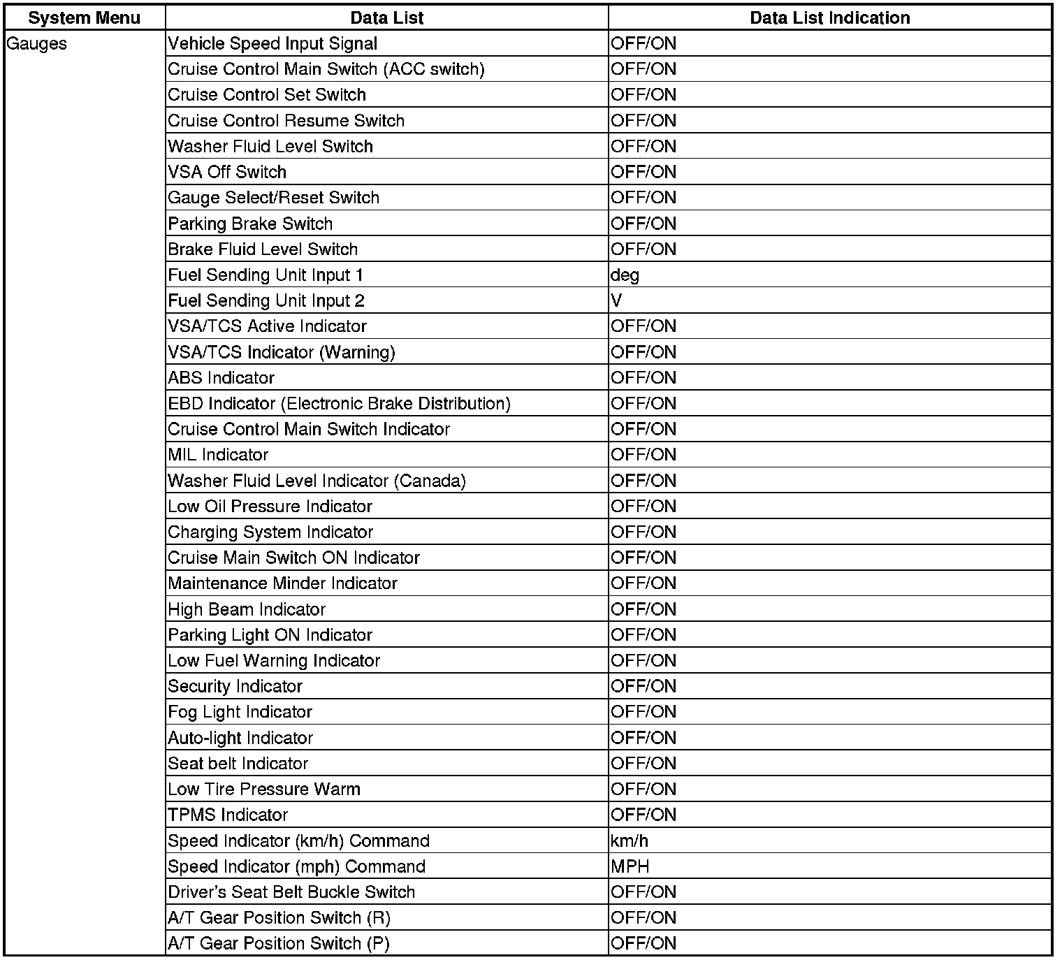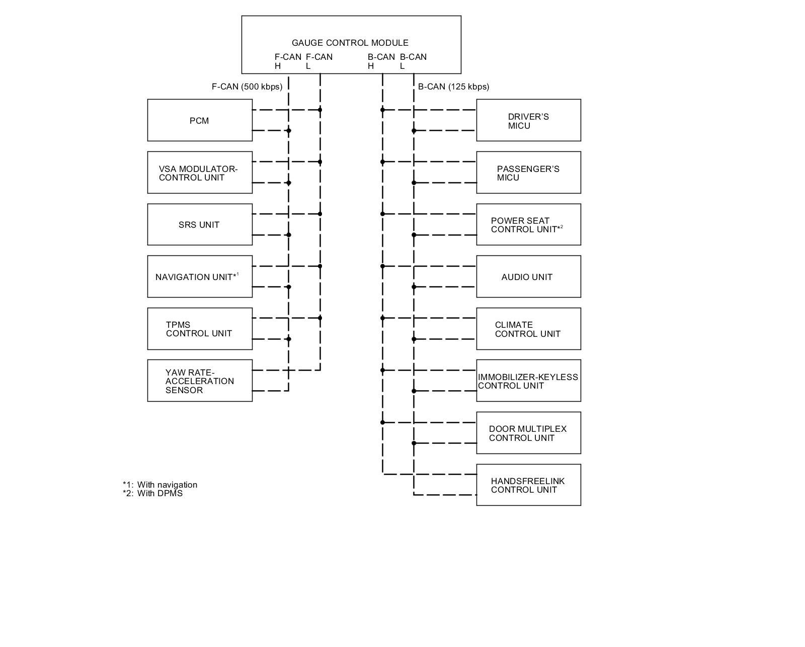 The body controller area network (B-CAN) and the fast controller area network (F-CAN) share information between multiple electronic control units (ECUs). B-CAN communication moves at a slower speed (125 kbps) for convenience related items and for other functions. F-CAN information moves at a faster speed (500 kbps) for "real time" functions such as fuel and emissions data. To allow both systems to share information, the gauge control module translates and relays the information from B-CAN to F-CAN and from F-CAN to B-CAN. This is called the Gateway Function.