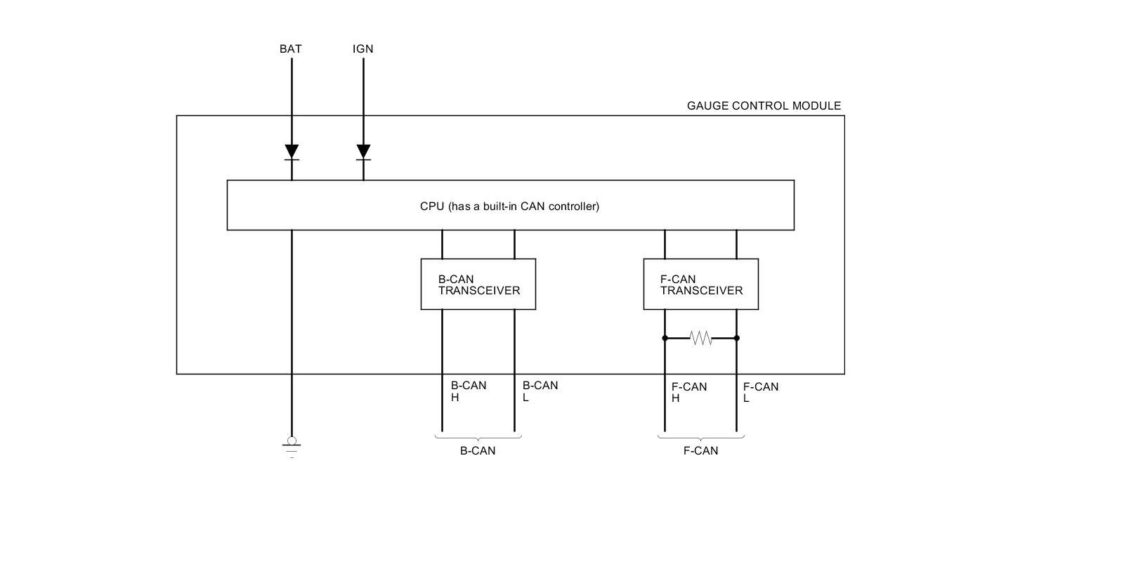 The gauge control module acts as a gateway to allow both systems to share information. The gauge control module translates and relays the information from B-CAN to F-CAN and from F-CAN to B-CAN.
