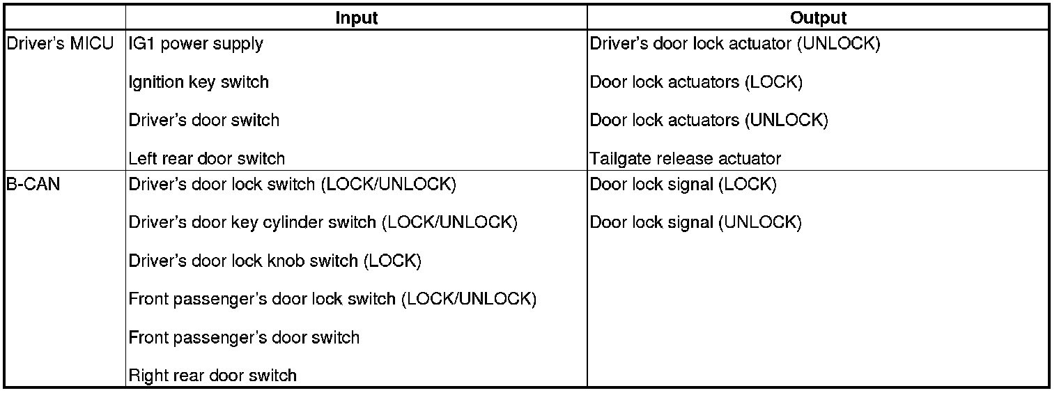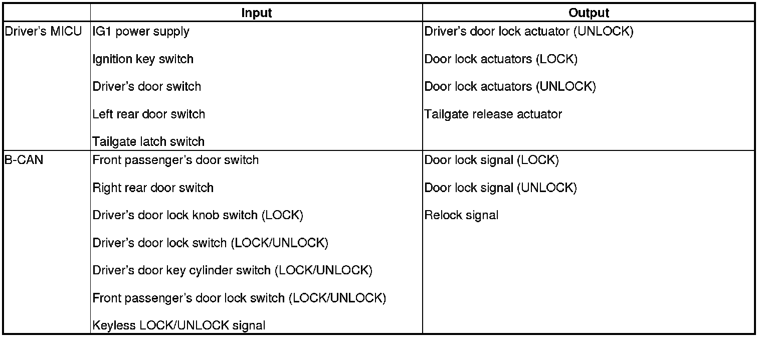 The driver's MICU controls the door lock actuators LOCK, UNLOCK, DRIVER'S UNLOCK, TAILGATE UNLOCK based on B-CAN door lock switch signals.