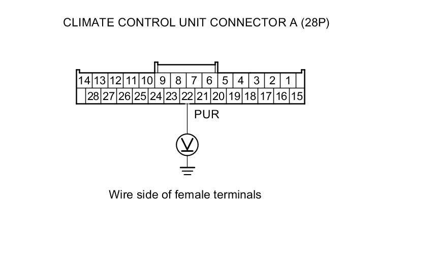 7. Measure the voltage between climate control unit connector A (28P) terminal No. 22 and body ground.