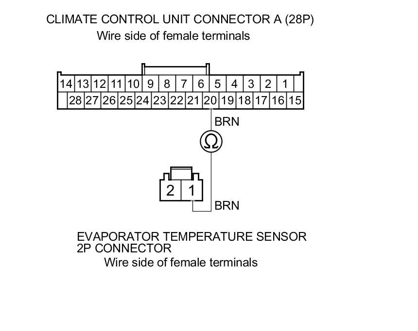 13. Check for continuity between climate control unit connector A (28P) terminal No. 20 and evaporator temperature sensor 2P connector terminal No. 1.