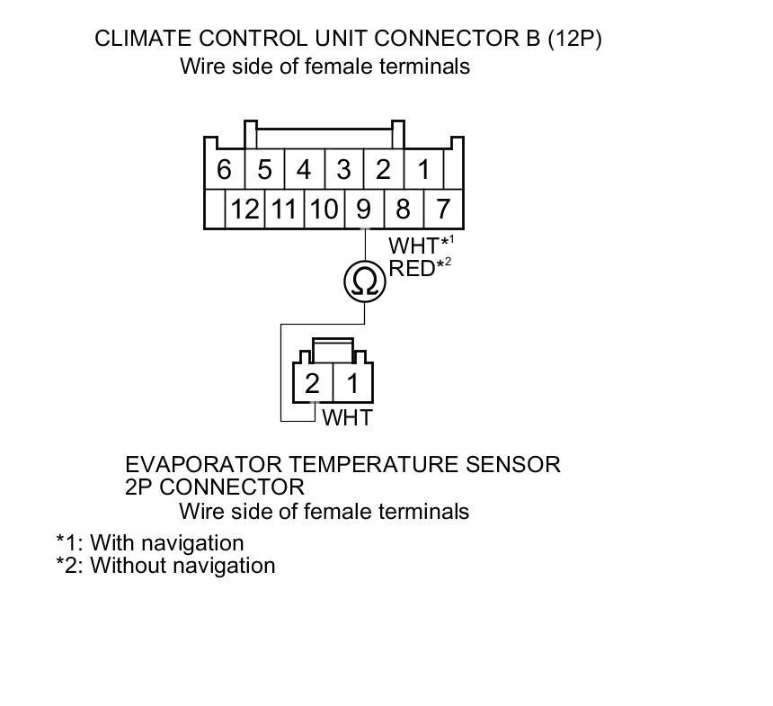 14. Check for continuity between climate control unit connector B (12P) terminal No. 9 and evaporator temperature sensor 2P connector terminal No. 2.