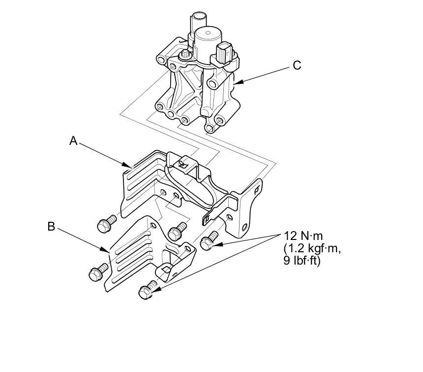 5. Remove the engine wire harness bracket (A) (also (B) (if equipped)) from the rocker arm oil control valve (C).