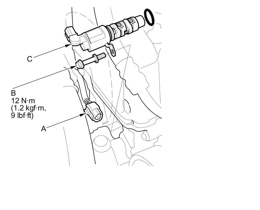 2. Remove the bolt (B) and the VTC oil control solenoid valve (C).