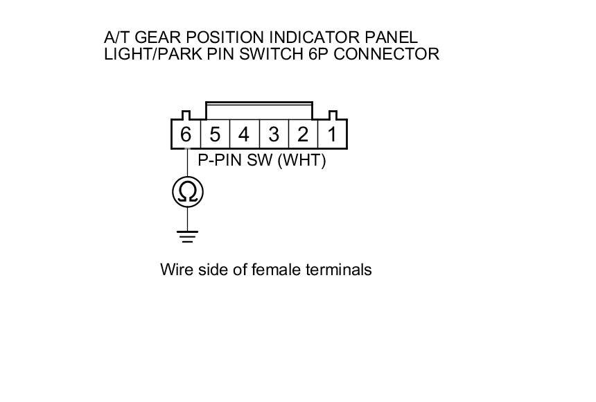 Check the park pin switch installation. If the switch installation is OK, the park pin switch is faulty; replace the A/T gear position indicator panel light/park pin switch A/T Gear Position Indicator Panel Light Harness Replacement, and retest.