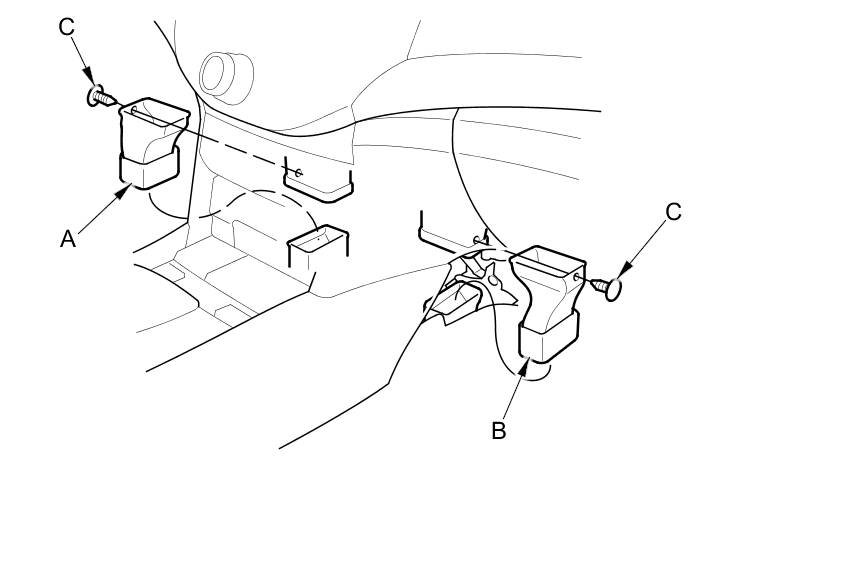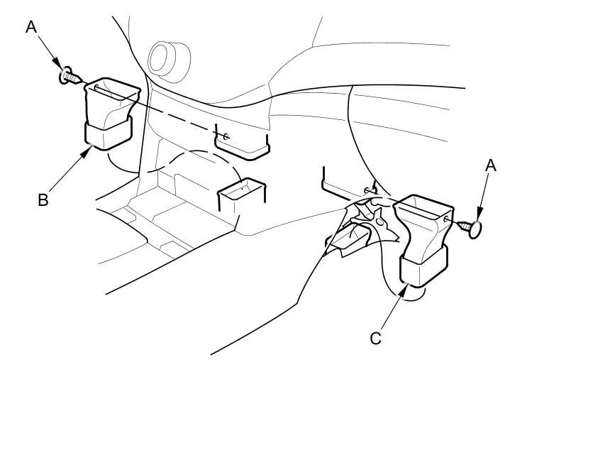 3. Remove the clips (A), then remove the left and right heater ducts (B, C).