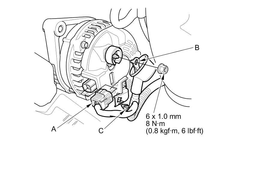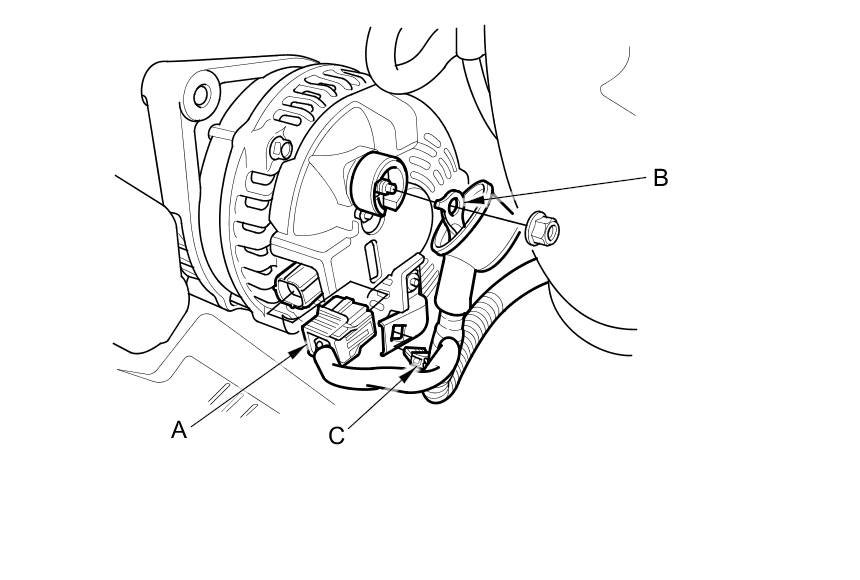 1. Install the alternator, then connect the alternator connector (A) and the positive alternator cable (B), and install the harness clamp (C). Make sure the crimped side of the ring terminal faces away from the alternator when you connect it.