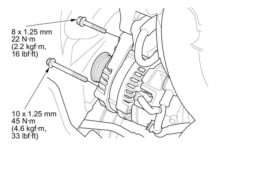 2. Tighten the two bolts securing the alternator.
