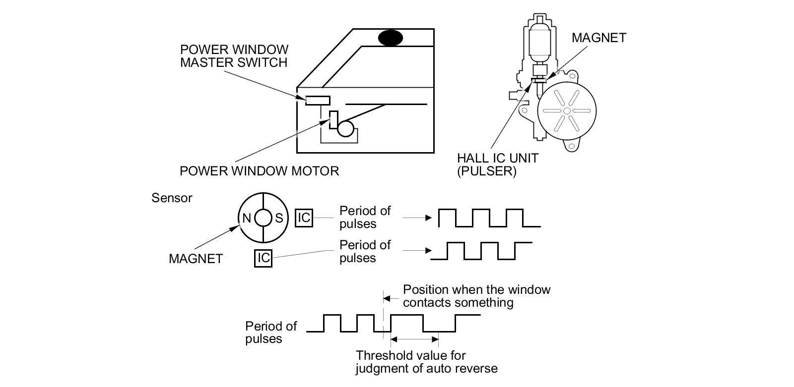 The driver's and front passenger's power window motors incorporate a Hall IC unit (pulse) which generates pulses during the motor's operation and sends pulses to the driver's and passenger's power window control units. As soon as the power window control units detect a change in the pulse frequency from the Hall IC unit (pulse), the power window control units make the power window motor stop and reverse. This prevents pinching your hand or fingers during auto-up operation. The auto reverse function dose not work when the power window master switch or front passenger's power window switch is held in the close position.