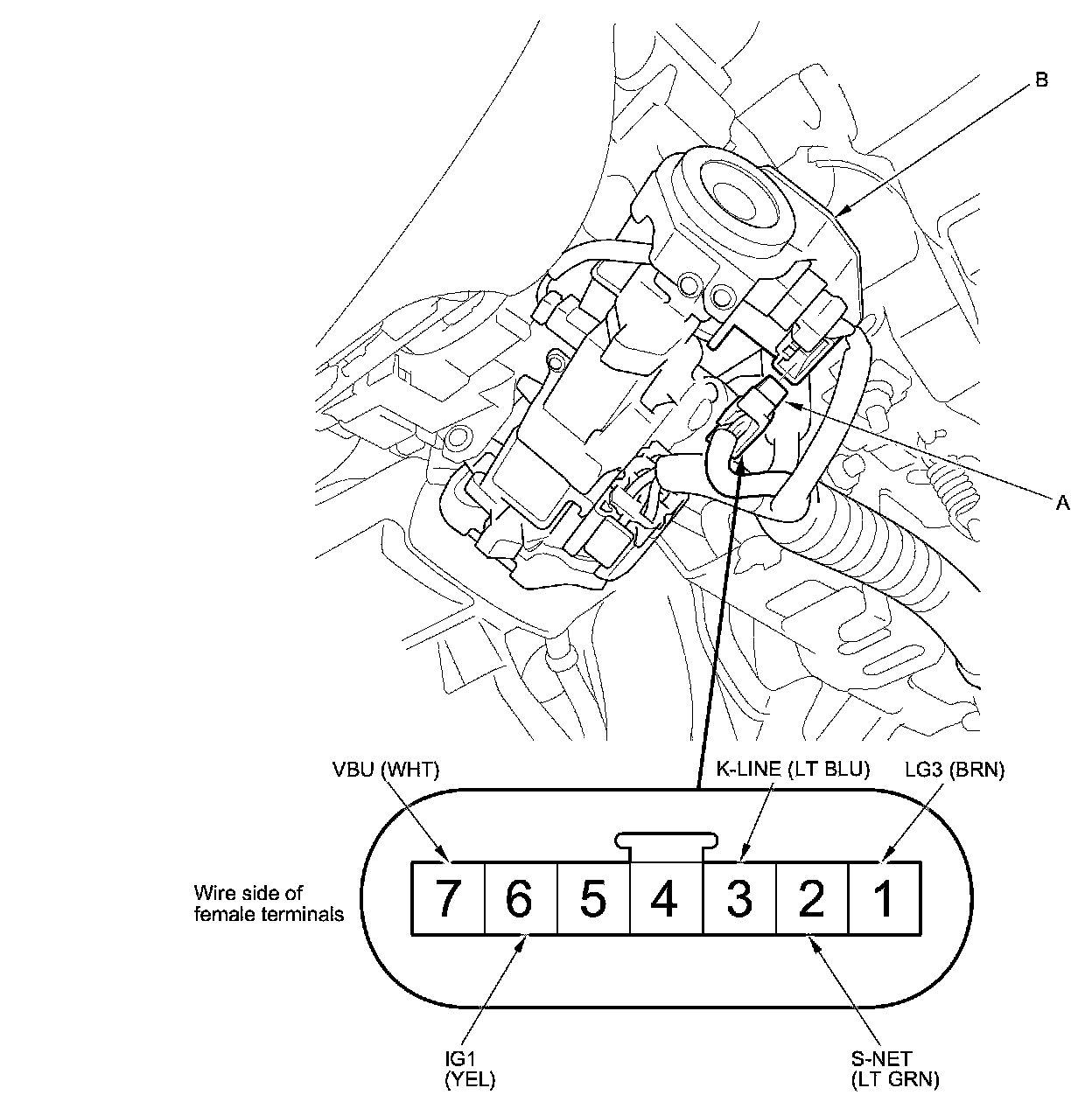 2. Disconnect the 7P connector (A) from the immobilizer-keyless control unit (B).