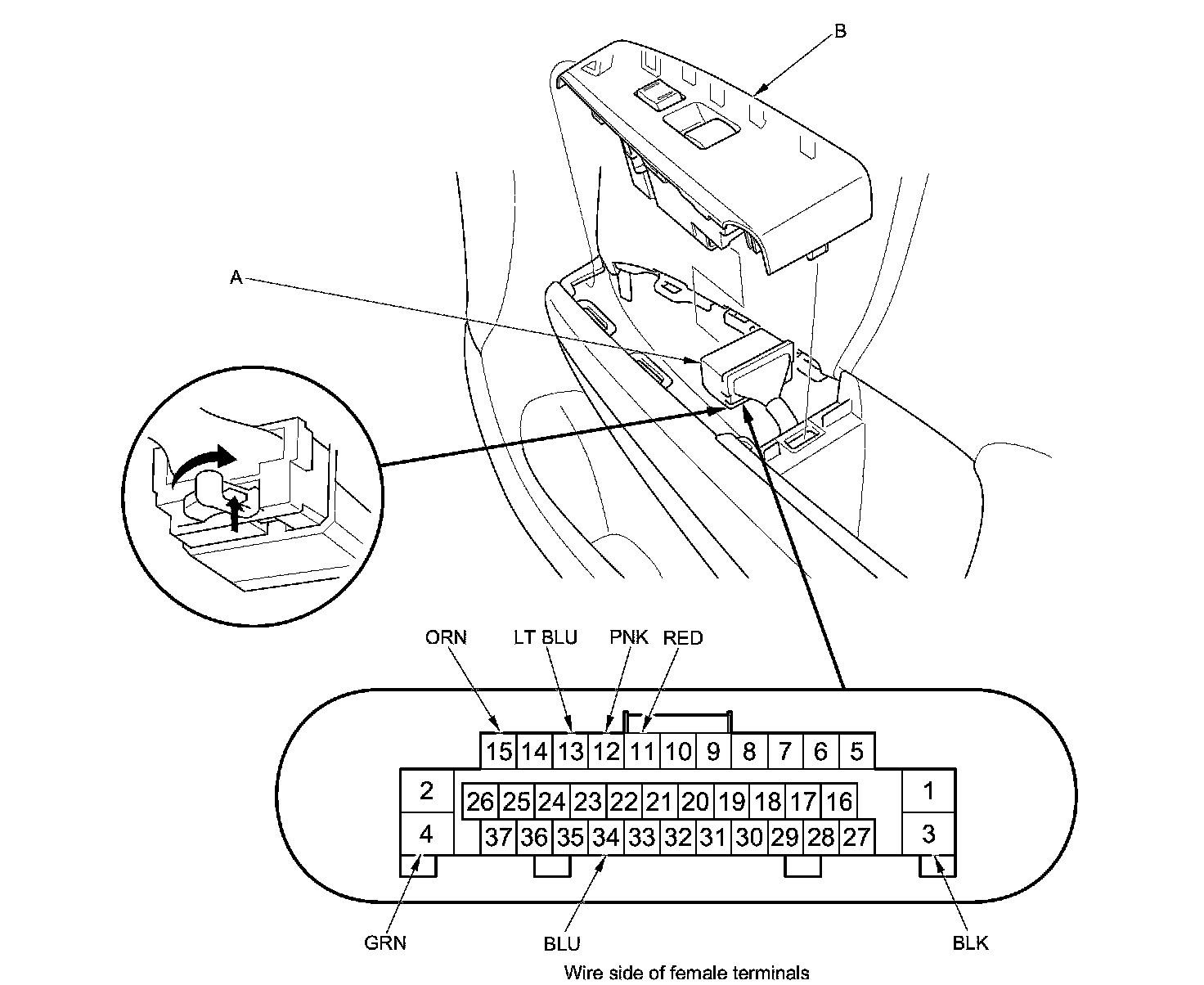 3. Disconnect the 37P connector (A) from the front passenger's power window switch (B).