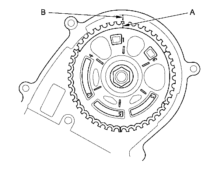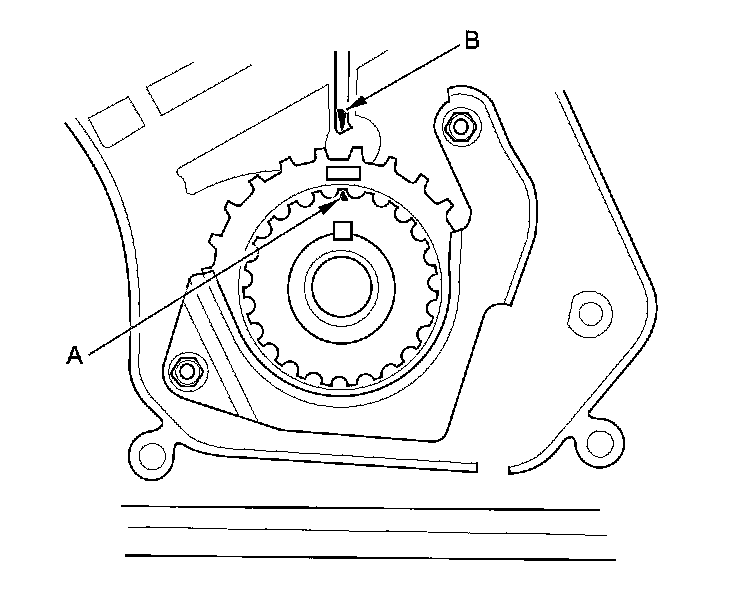 Set the timing belt drive pulley to top dead center (TDC) by aligning the TDC mark (A) on the tooth of the timing belt drive pulley with the pointer (B) on the oil pump.