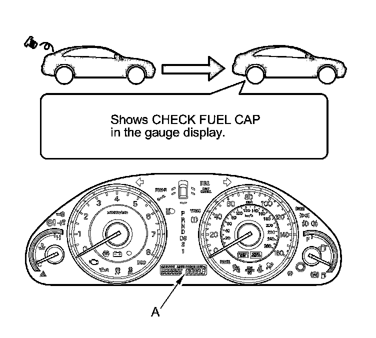 The first time a leak is detected, a CHECK FUEL CAP message appears in the gauge display (A). To scroll to another message, press the select/reset button. The CHECK FUEL CAP message appears each time you restart the engine until the system turns the message off. Turn the engine off, then replace or tighten the fuel fill cap until clicks at least once.
