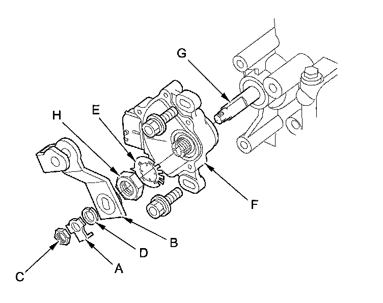 9. Pry the lock tabs of the lock washer (E) on the transmission range switch (F), hold the selector control shaft (G) with a 6.0 mm wrench, and loosen the locknut (H).