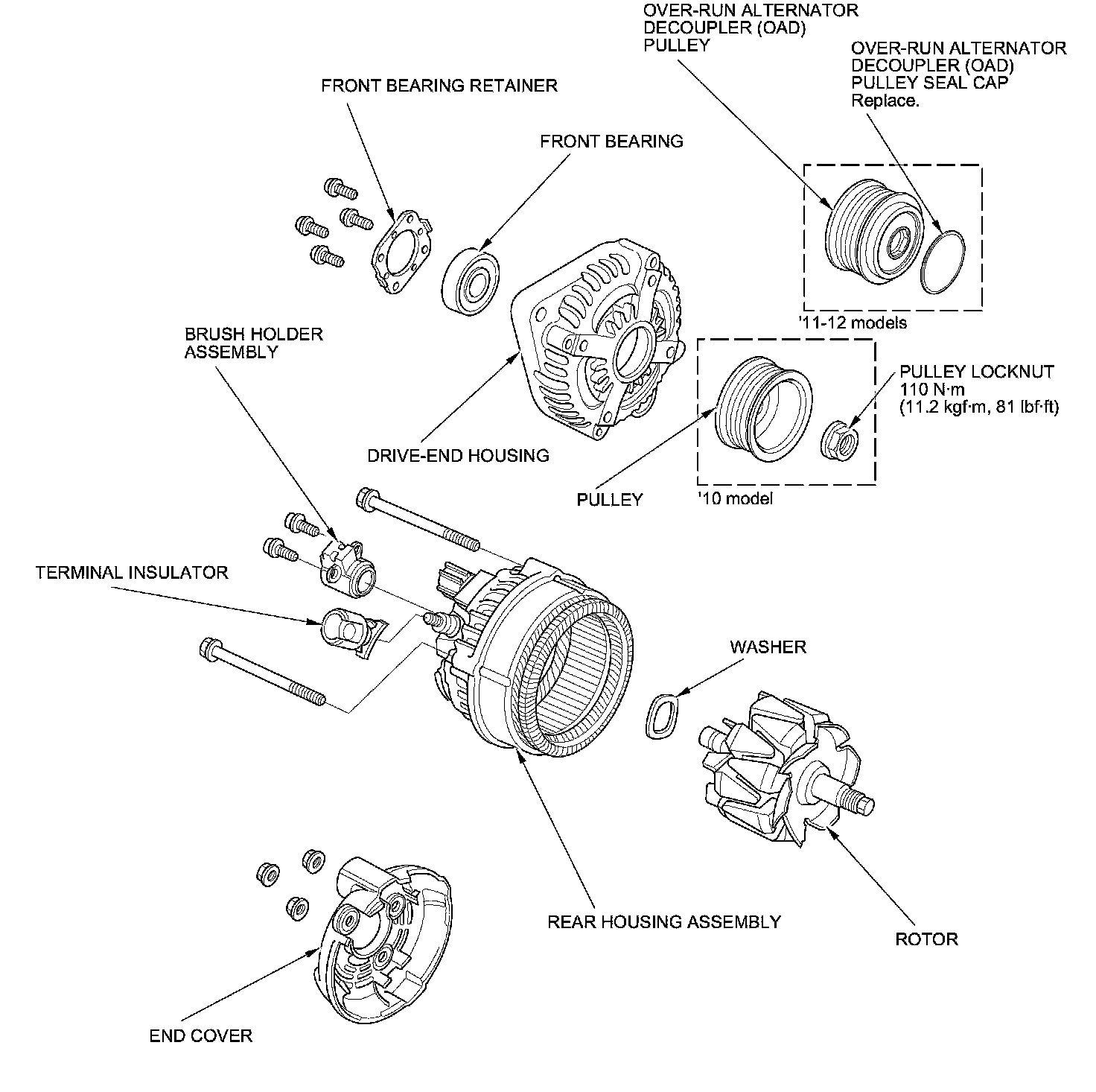 17. '10 model: If you removed the pulley, put the rotor in the drive-end housing, then torque its locknut to 110 Nm (11.2 kg-m, 81 lb-ft).