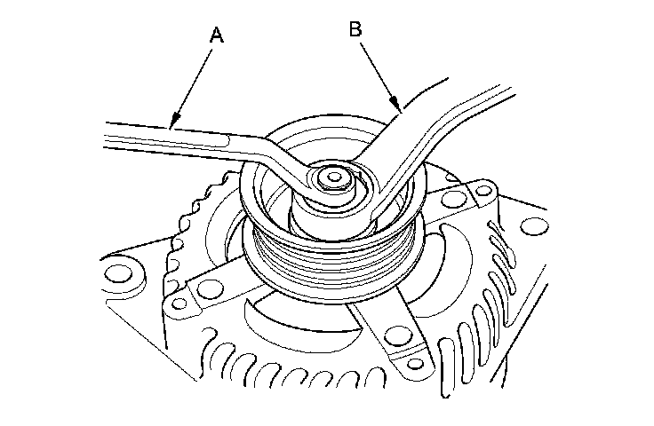 3. '10 model: If the front bearing needs replacing, remove the pulley locknut with a 10 mm wrench (A) and a 22 mm wrench (B). If necessary, use an impact wrench.