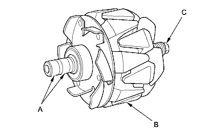 16. Check for continuity between each slip ring and the rotor (B) and the rotor shaft (C):
