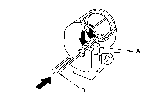 21. Push the brushes (A) in, then insert a pin or drill bit (B) (about 1.6 mm (1/16 in) diameter) to hold them there.