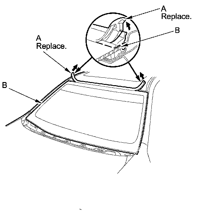 2. Remove the windshield molding (A) from the upper edge of the windshield (B). If necessary, cut the windshield molding with a utility knife.