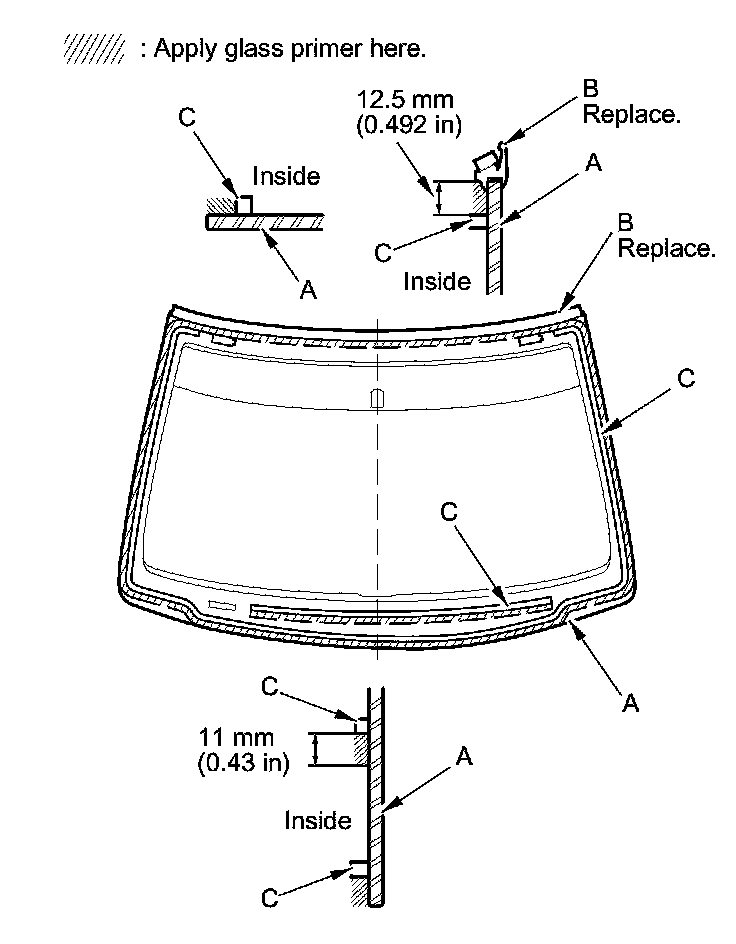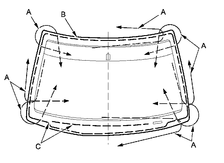 18. Apply a light coat of glass primer to the windshield (A) along the edge of the windshield molding (B) and the rubber dams (C) as shown, then lightly wipe it off with gauze or cheesecloth: