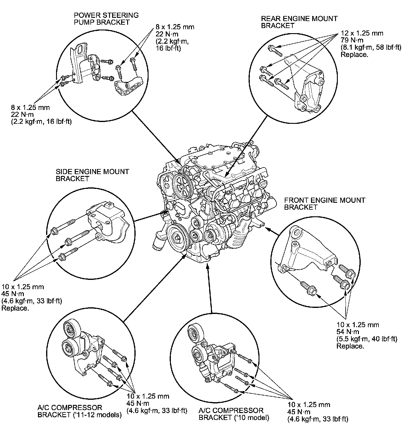 1. Install the engine mount brackets and the accessory brackets, then tighten their bolts to the specified torque.