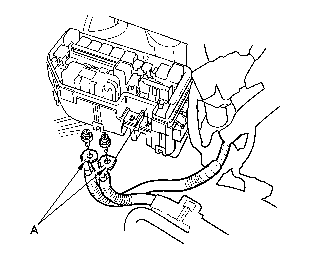 54. Connect the battery cables (A) to the under-hood fuse/ relay box.