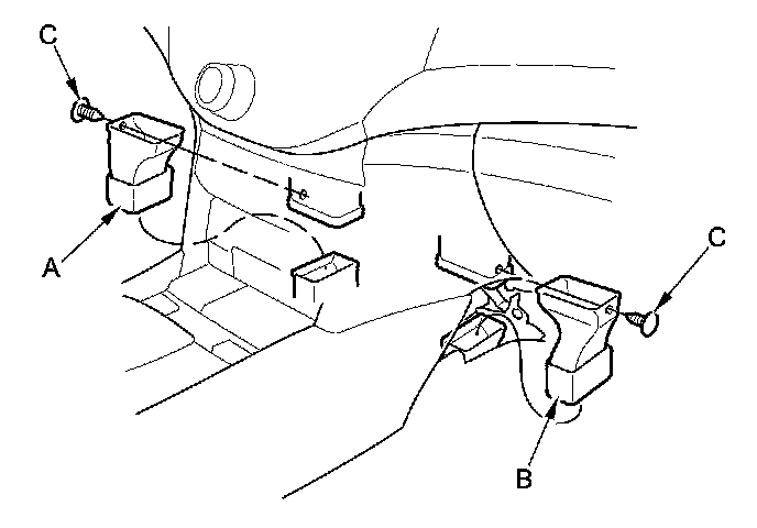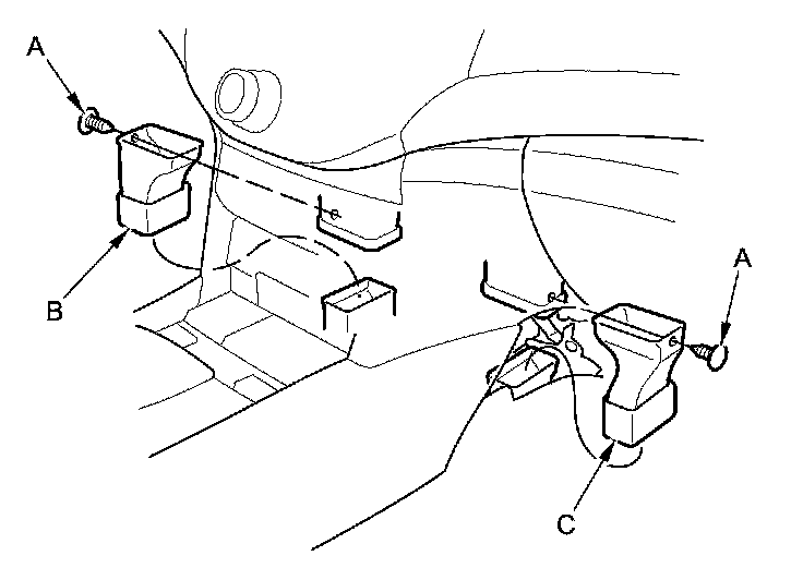 3. Remove the clips (A), then remove the left and right heater ducts (B, C).