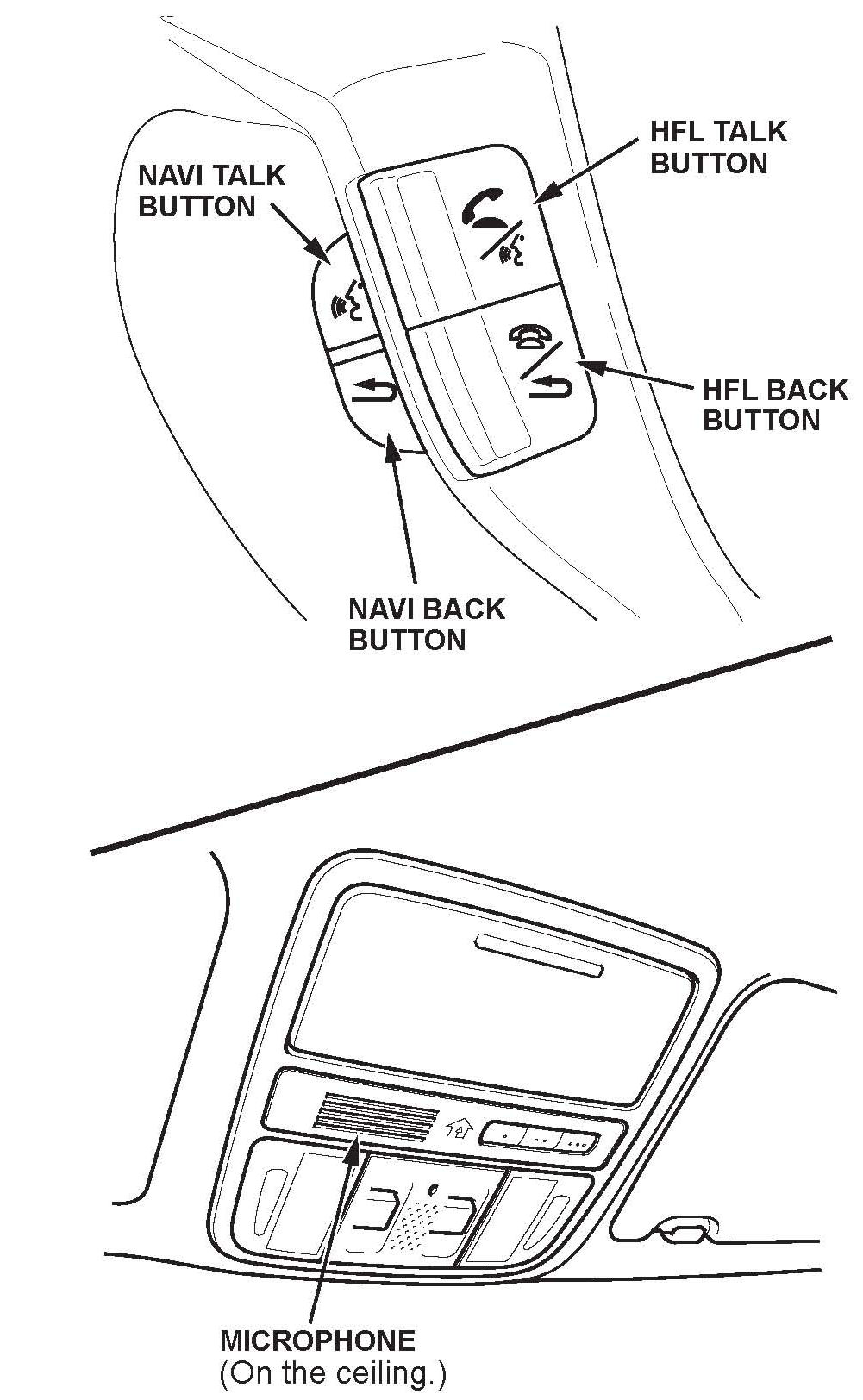 The navigation system features a voice control system that allows you to operate most of the navigation, HVAC, and audio controls with only your voice. To interact with the navigation system, use the NAVI TALK and NAVI BACK buttons. The microphone is located on the ceiling. This is the primary way to give commands to the system.