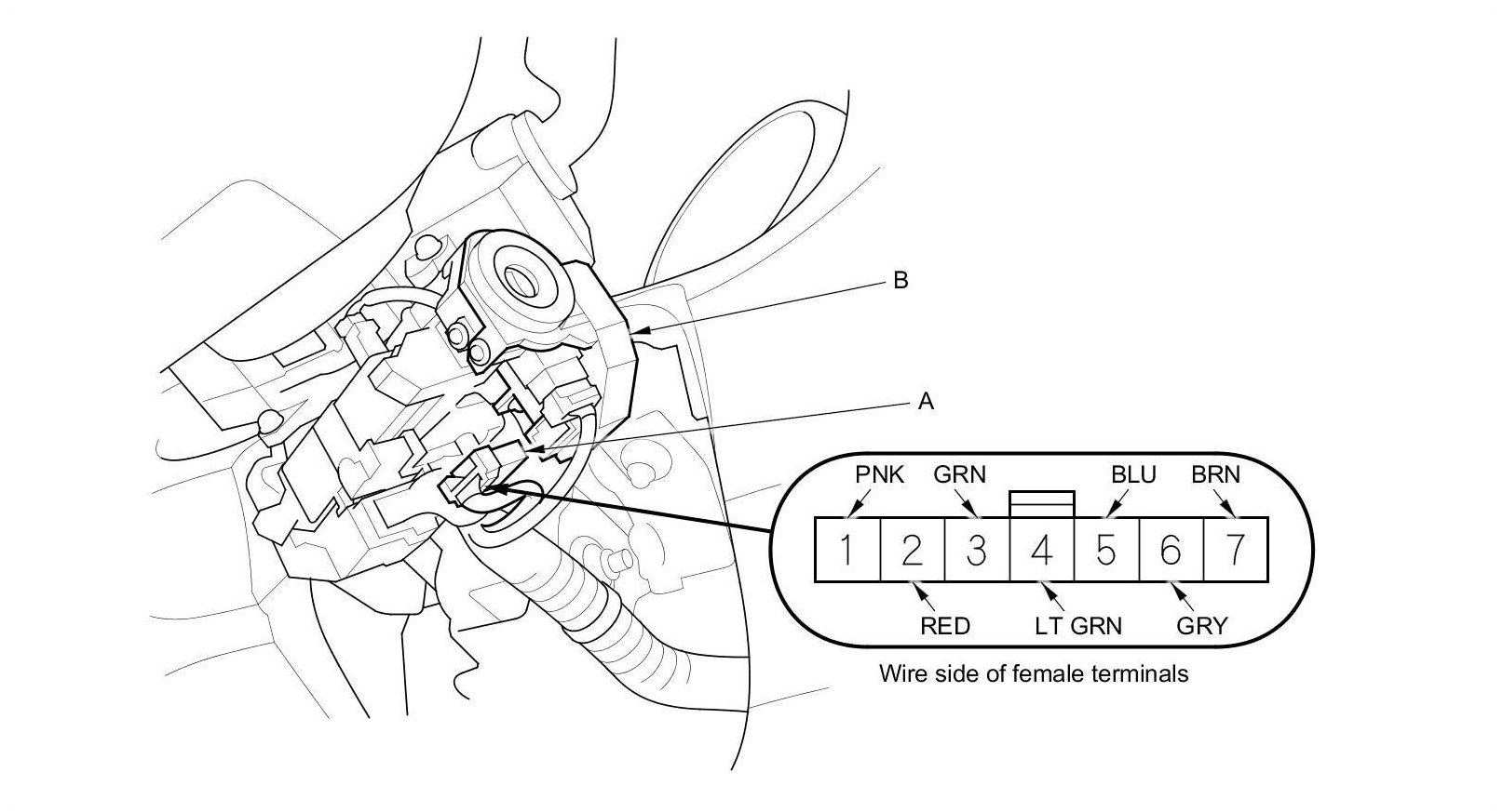 2. Disconnect the 7P connector (A) from the immobilizer-keyless control unit (B).