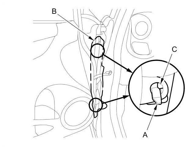 - Before installing the clips, make sure the hooks (A) of the front fender fairing (B) are installed into the holes (C) in the front fender securely.